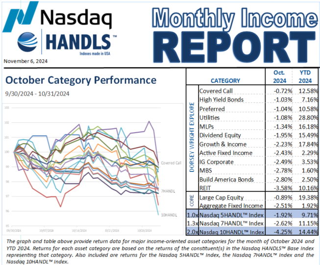 The Nasdaq Dorsey Wright Explore portion of the HANDLS Indexes experienced negative performance across all categories in October. Interest-rate-sensitive sectors struggled the most, while more equity-like categories showed relative resilience. The worst performer was REITs, which lost more than 3.5% for the month but remained positive year-to-date.